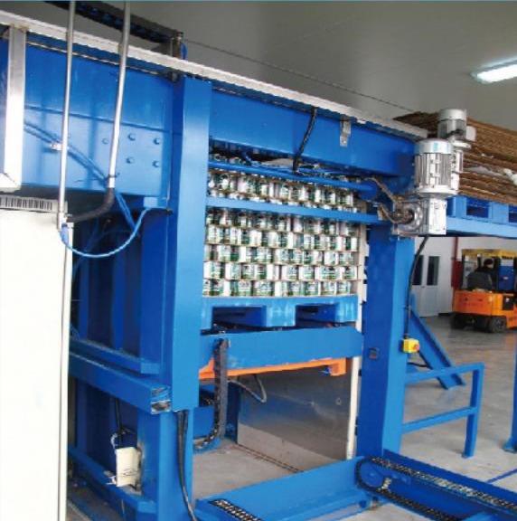 - Автоматическая штабелирующая машина (поддон), автоматическое вытягивание цепи из доски (поддон), удаление корпуса пустого поддона (вилочный погрузчик).